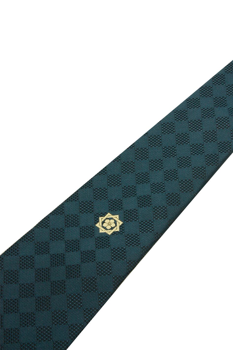 紺青の市松模様をベースのネクタイに、ポイントとして坂本家の家紋「組み合い角に桔梗紋」をあしらいました。 比較的シンプルで、落ち着きのあるデザインとなっています。
